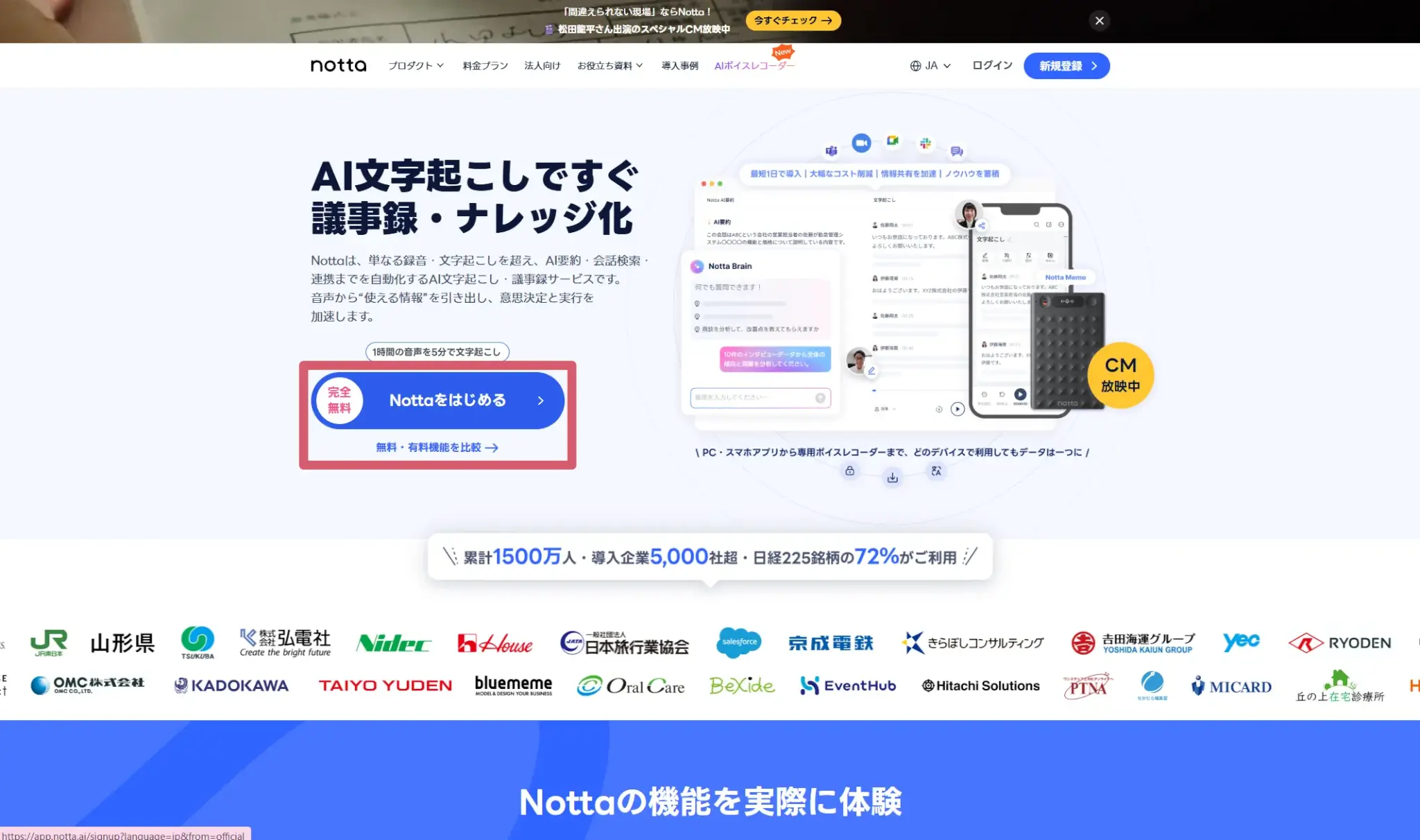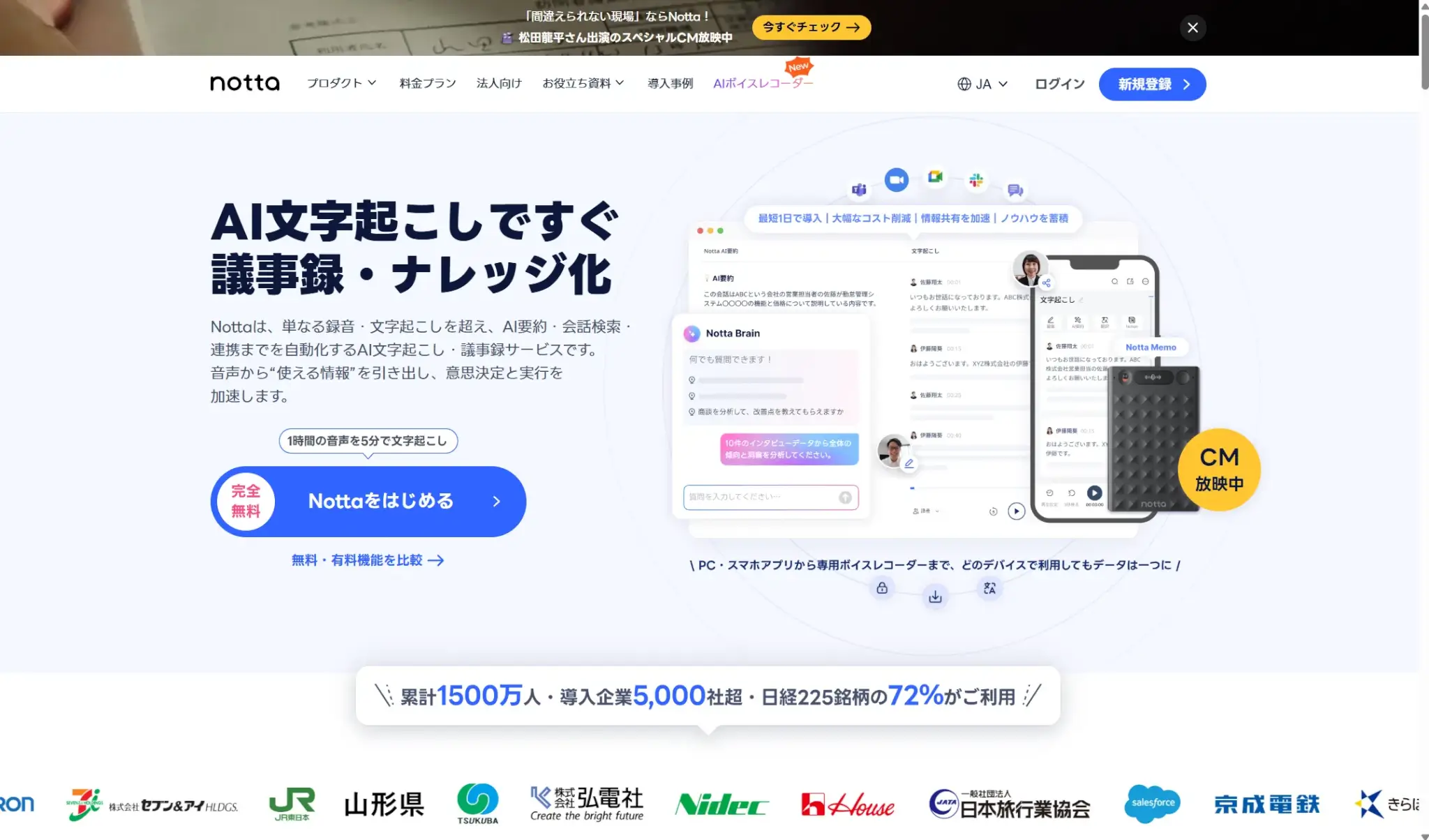 Nottaは、録音した音声を文字起こしし、要約、議事録まで作成できるAI文字起こしツールです。会議の記録をあとで読み返す人、要点だけ抜き出して共有したい人、録音データをテキストにして保存したい人に向いています。