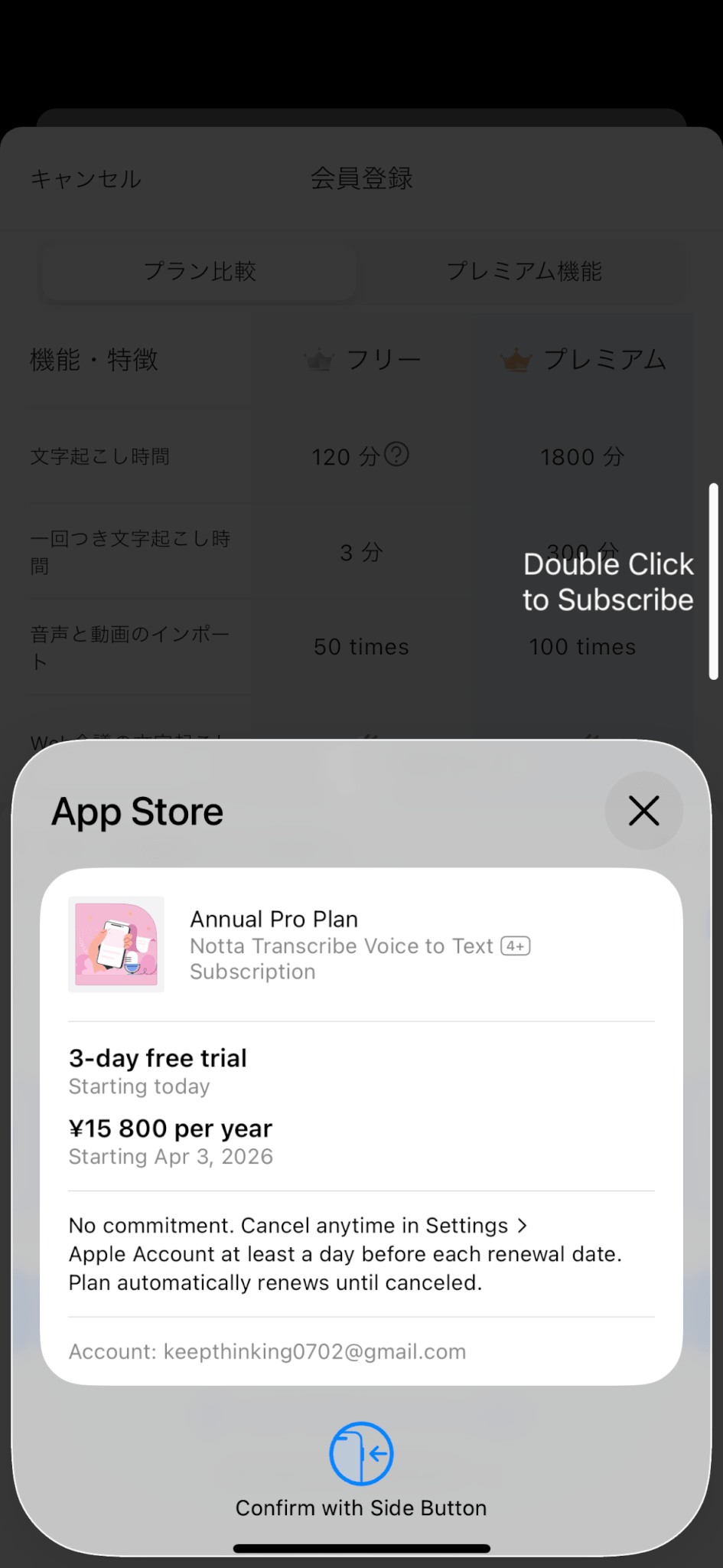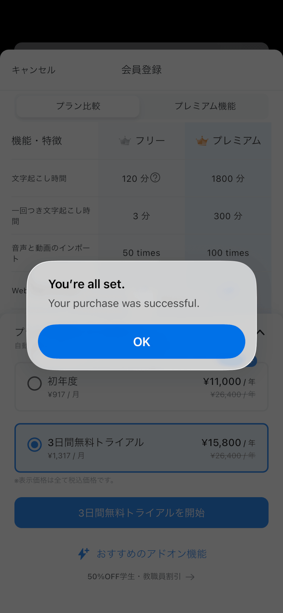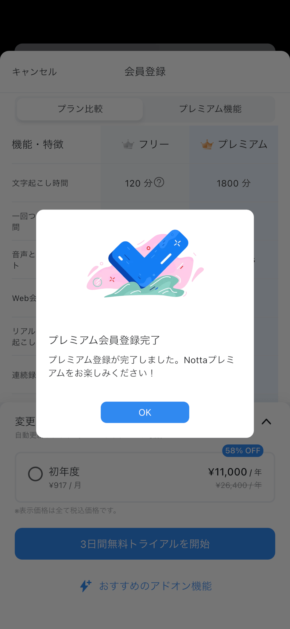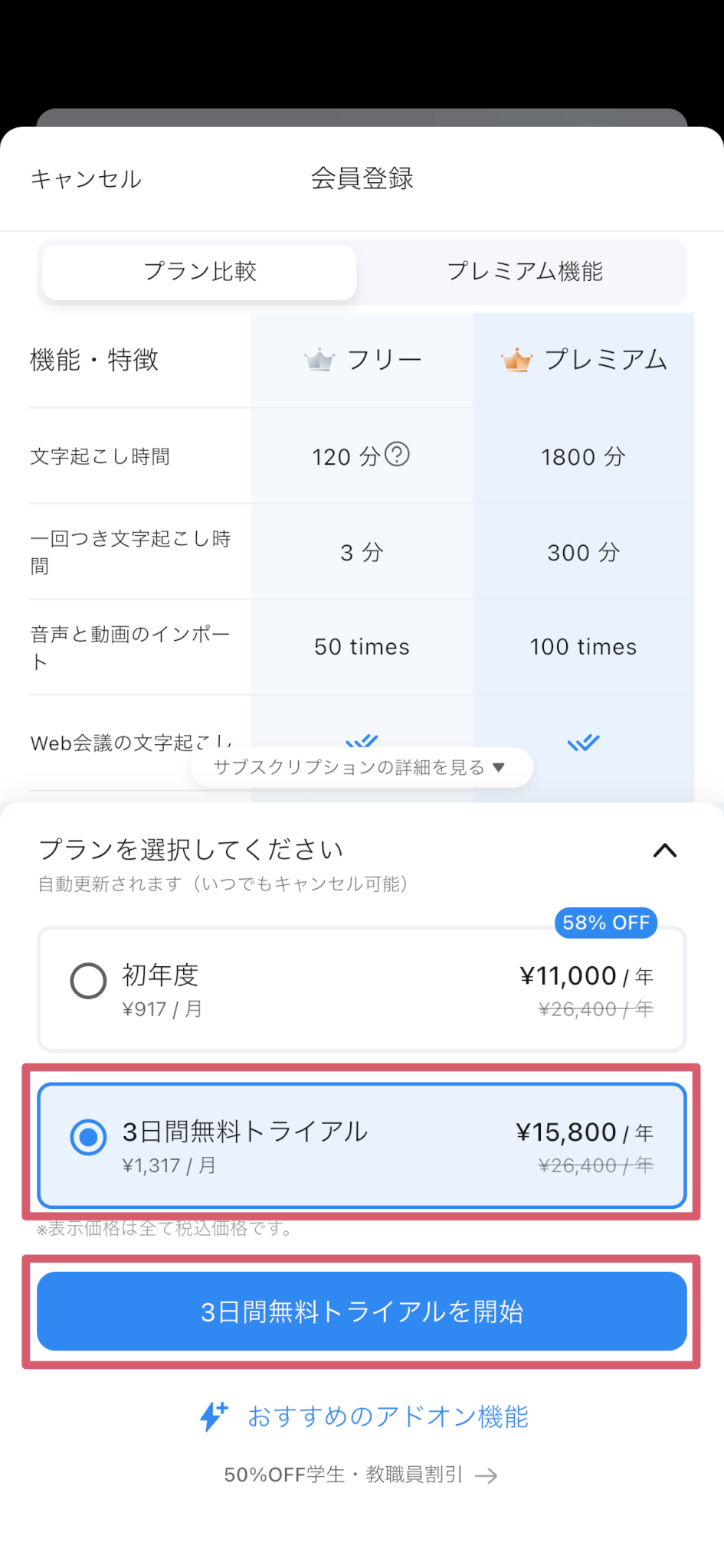 アプリ版の無料トライアルは、3日間で1,800分まで使えます。プレミアム会員と同じ機能を試せるため、スマホを使ってより長めの録音を試したい人には使いやすい条件です。