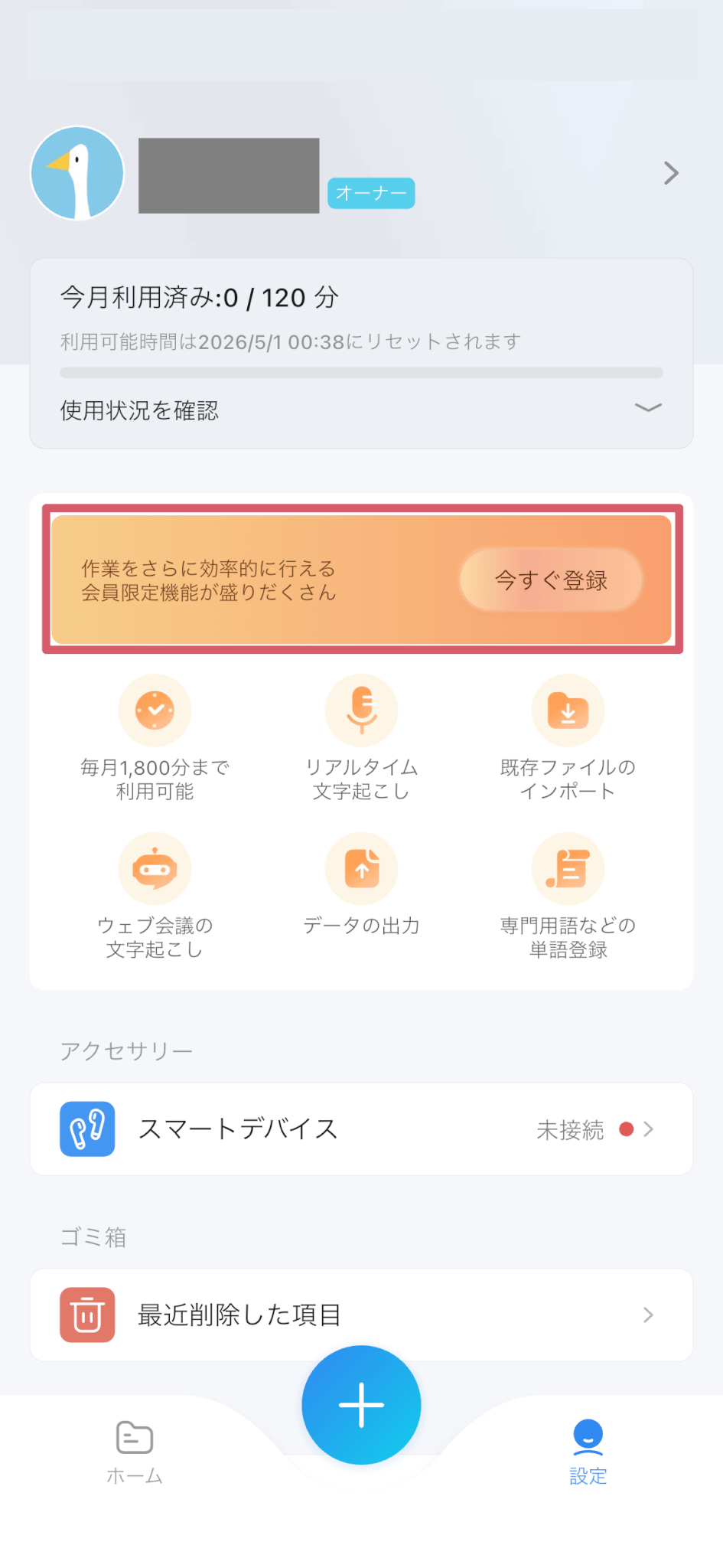 | 文字起こし時間 | 120分/月 3分/回まで | 300分/3日間 | 1,800分/3日間 | 120分/3日間 |