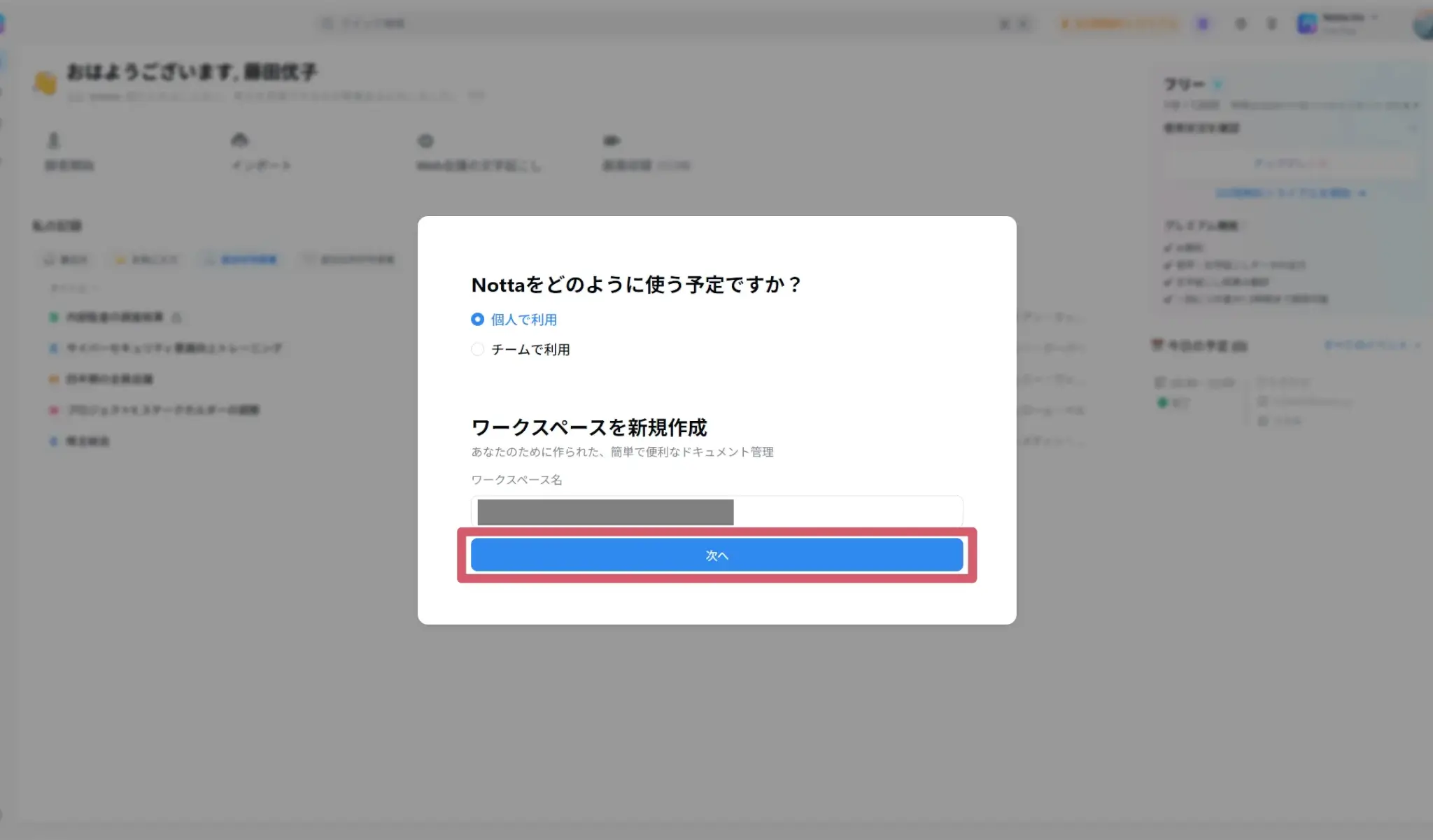 ワークスペースの名前を入力します。これでアカウント登録は完了です。