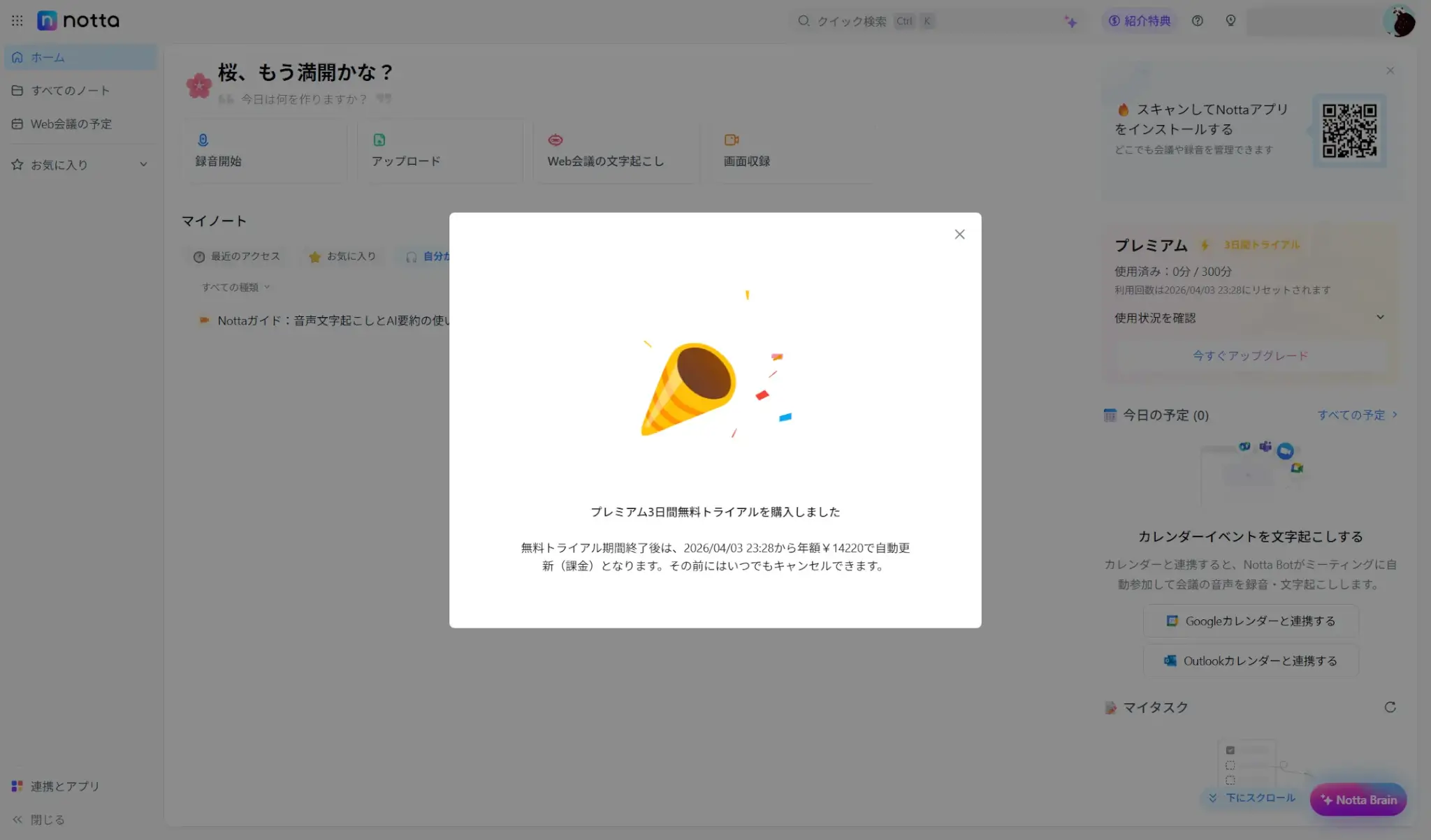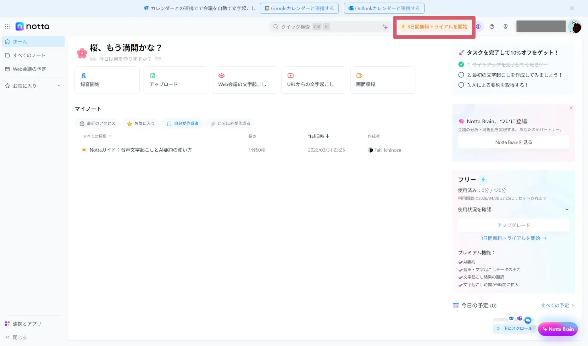 即座に有料プランへ踏み切れない場合は、3日間の無料トライアルで、文字起こしやAI要約の精度を確認するのがおすすめです。ウェブ版は300分、アプリ版は1,800分まで文字起こしを試せます。