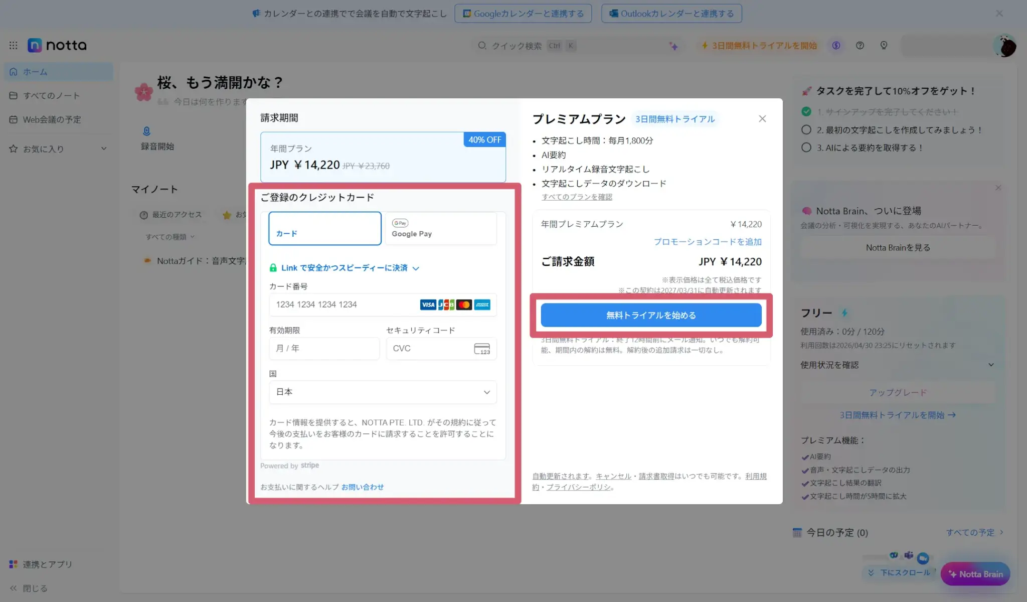 Web版の無料トライアルは、3日間で300分まで使えます。クレジットカードの登録は必要ですが、プレミアム会員と同じ機能を試せます。