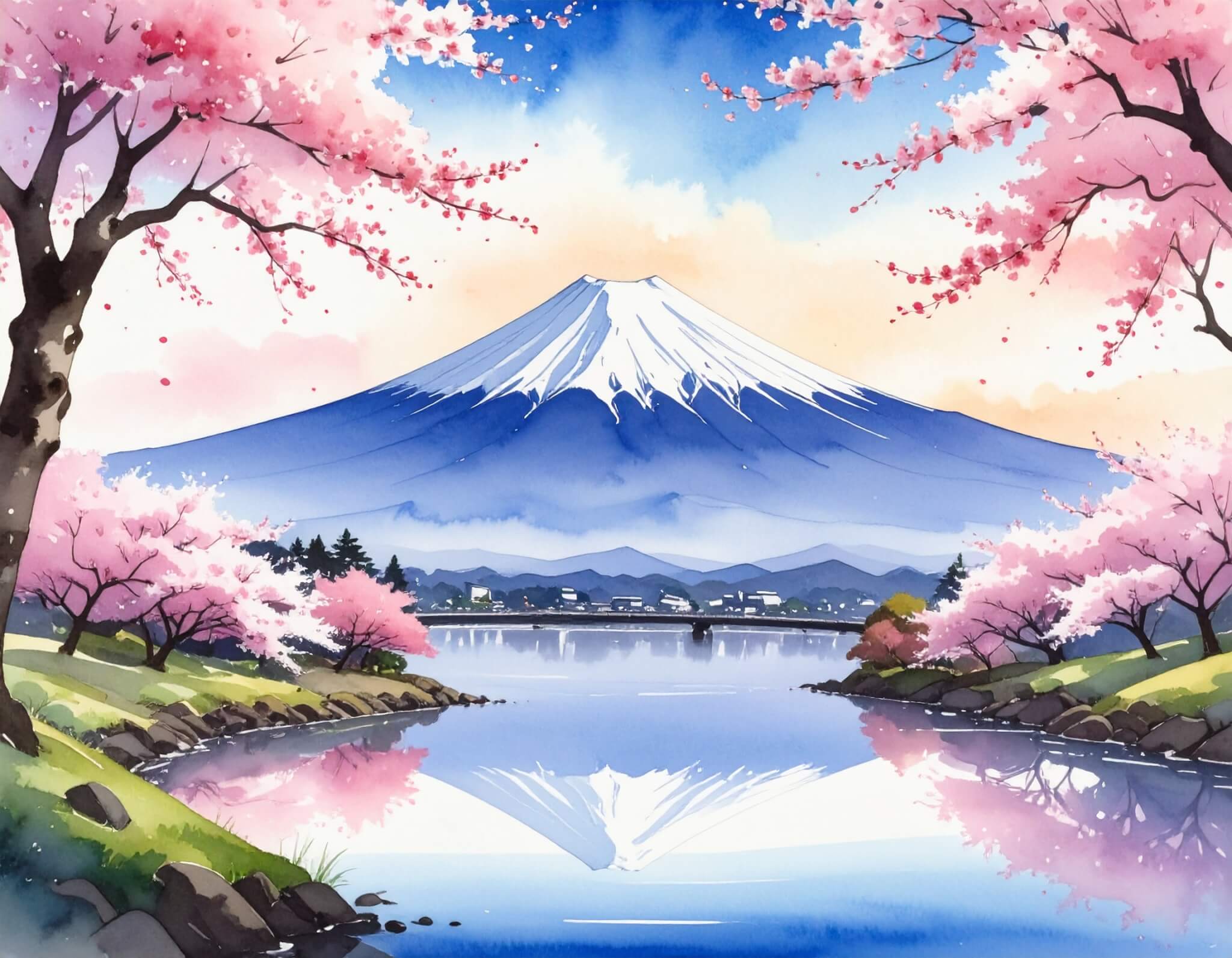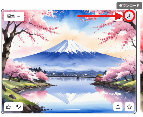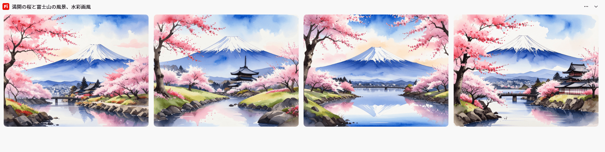 今回生成した画像がこちらです。指示通り、満開の桜と富士山が、水彩画風に描かれています。