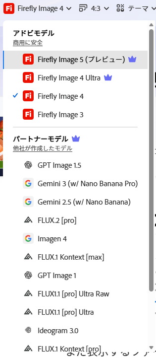 モデルを選択します。商用利用の場合はAdobe Fireflyのモデルを使用すると安心です。