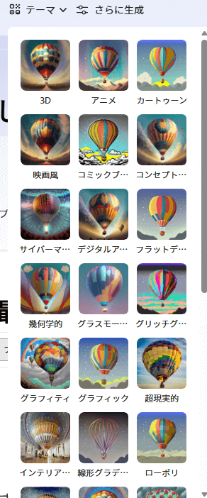 テキストプロンプトを入力するだけで、リアルな写真からイラスト風の画像まで、幅広いスタイルの画像を生成できます。