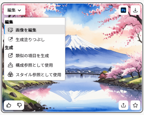 生成された画像の中から気に入ったものを選びます。「編集」ボタンを押すと、色調整や細部の修正ができます。