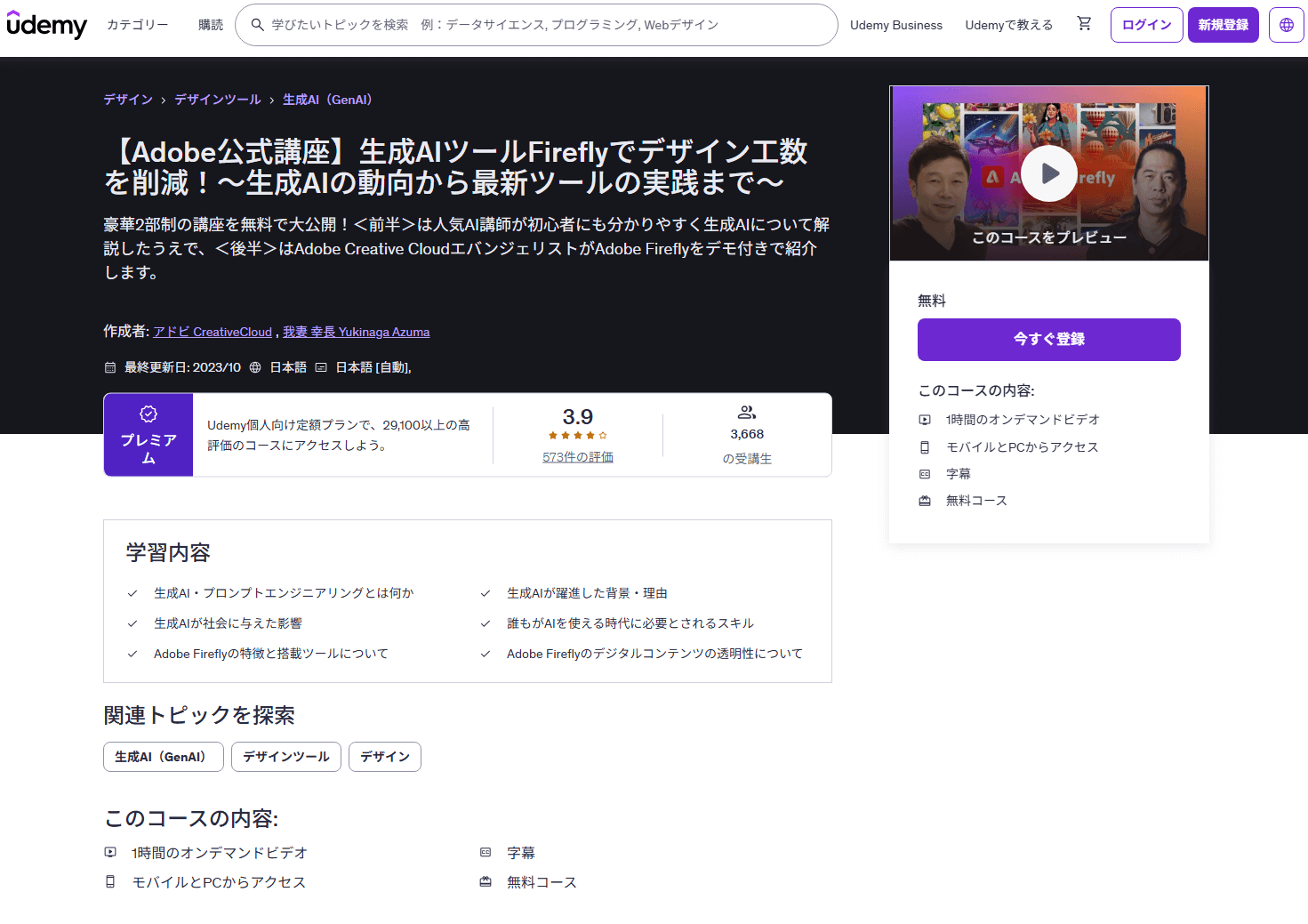 Adobe社はUdemy上で、公式の無料講座「生成AIツールFireflyでデザイン工数を削減!~生成AIの動向から最新ツールの実践まで~」を公開しています。