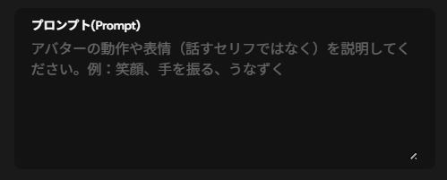 例えば「笑顔で話す」「歌うように」などと入力すると表情変化や動きのニュアンスに影響を与える可能性があります。