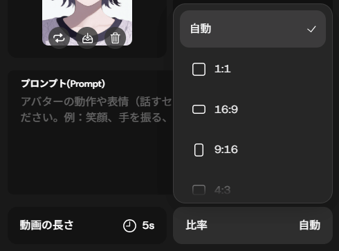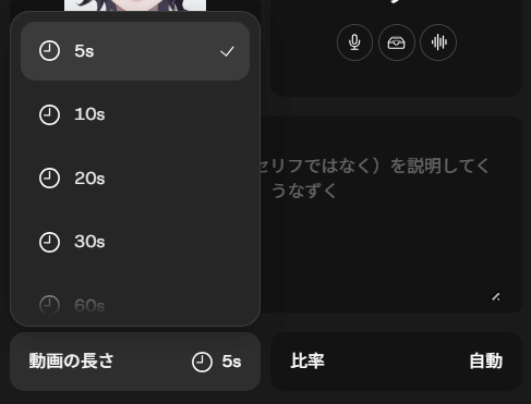| 出力形式(仕様) | 解像度・比率・尺を先に決め、生成時に秒数と画角を設定する |