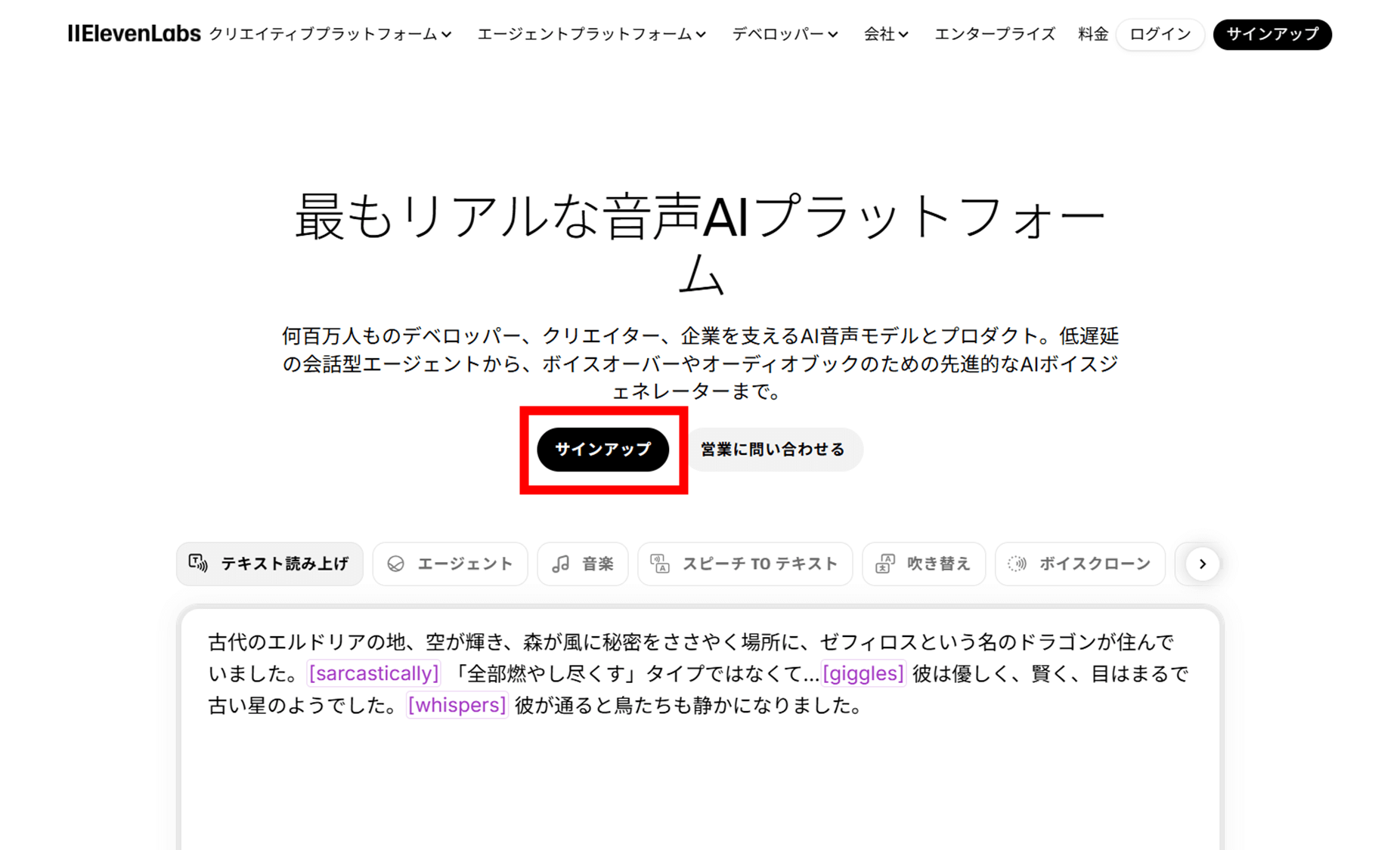 ElevenLabsの公式サイトにアクセスします。右下に「日本語に切り替える」のポップアップが出る場合はクリックして日本語表示に切り替えます。