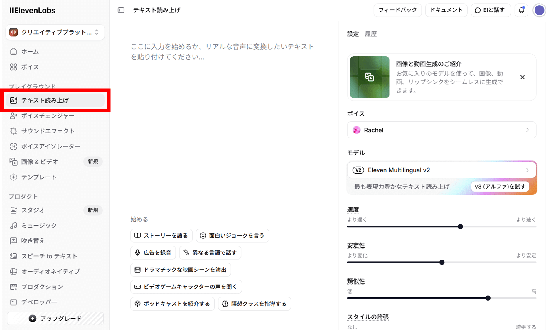 中央の「テキスト読み上げ」の下の入力欄に読み上げたいテキストを入力します。