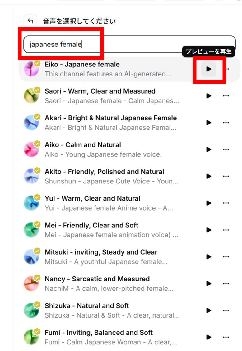 音声の検索バーに「japanese female」など使用したい音声の属性に合わせた検索ワードを入力します。各音声のサンプルボイスは矢印のアイコンから再生することができます。