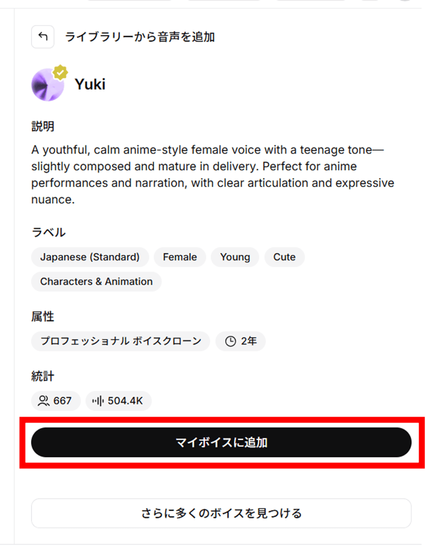 使用したいボイスを決定したらクリックし、「マイボイスに追加」をクリックします。今回はアニメーションスタイルのアバター素材を使用するため、アニメスタイルのボイスを選択しました。