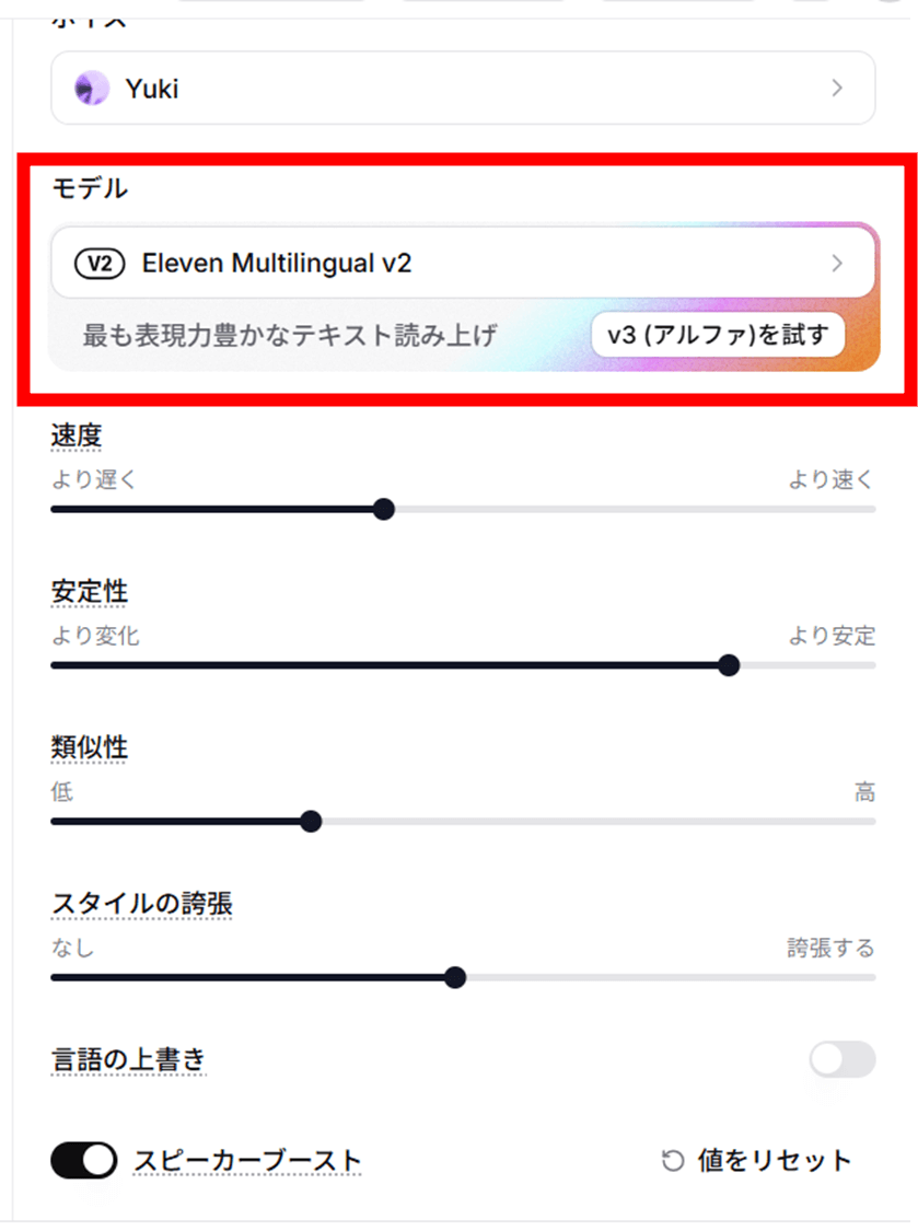 モデルとボイスの組み合わせによって、読み上げの良し悪しが変化する場合があるため、一度ボイスを生成してから別のモデルを試すと良いでしょう。ここでは「Eleven Flash v2.5」モデルを選択します。