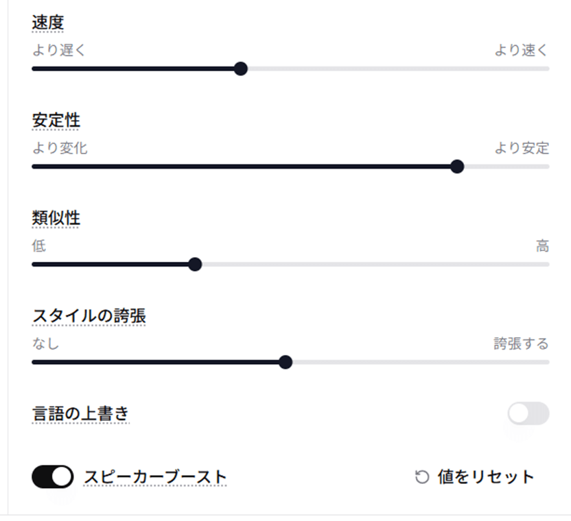 ElevenLabsの音声は初期状態でも自然ですが、スライダーと台本の両面から調整できます。