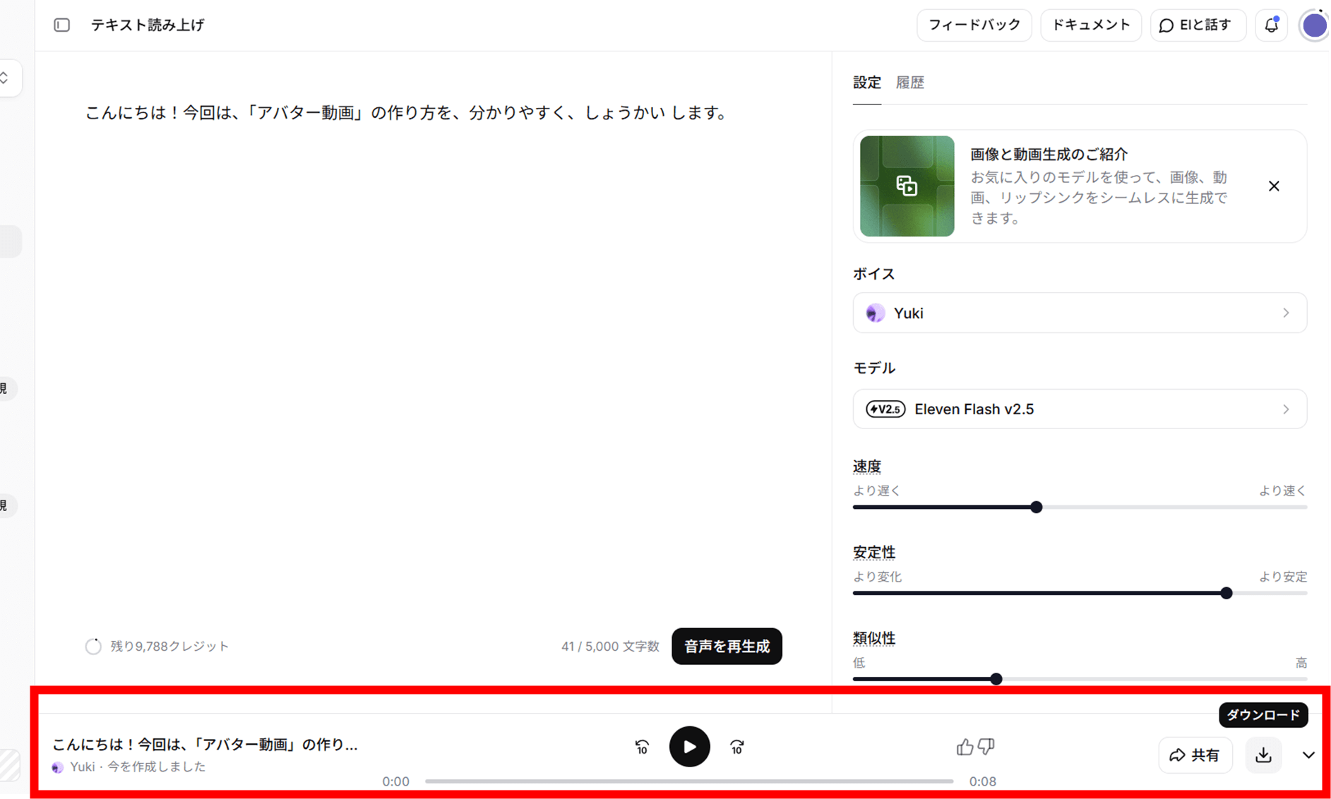 画面下部から生成されたボイスの再生とダウンロード(MP3(128kbps)/WAV)を行うことができます。