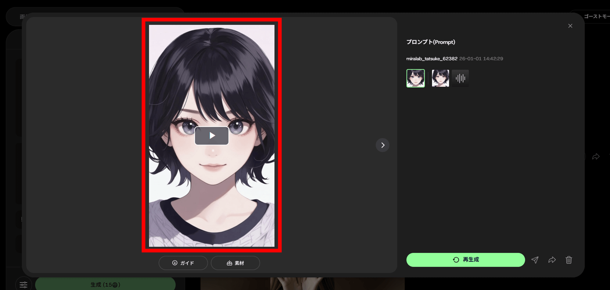 素材のアップロードと設定が完了したら「生成」をクリックします。