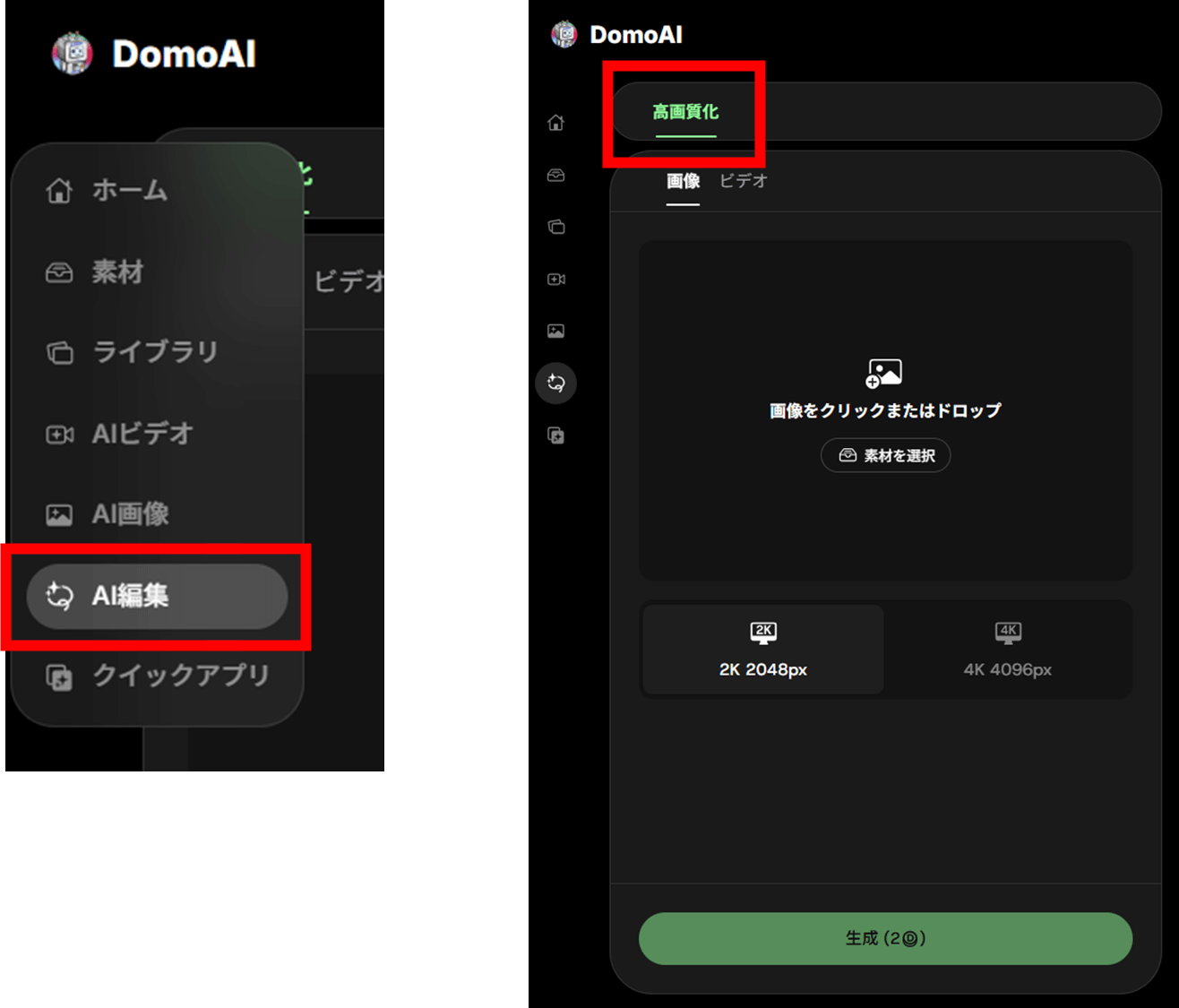 解像度は初期生成後にアップスケールする形が基本で、メニューの「AI編集」から、2Kや4Kに拡張できます。