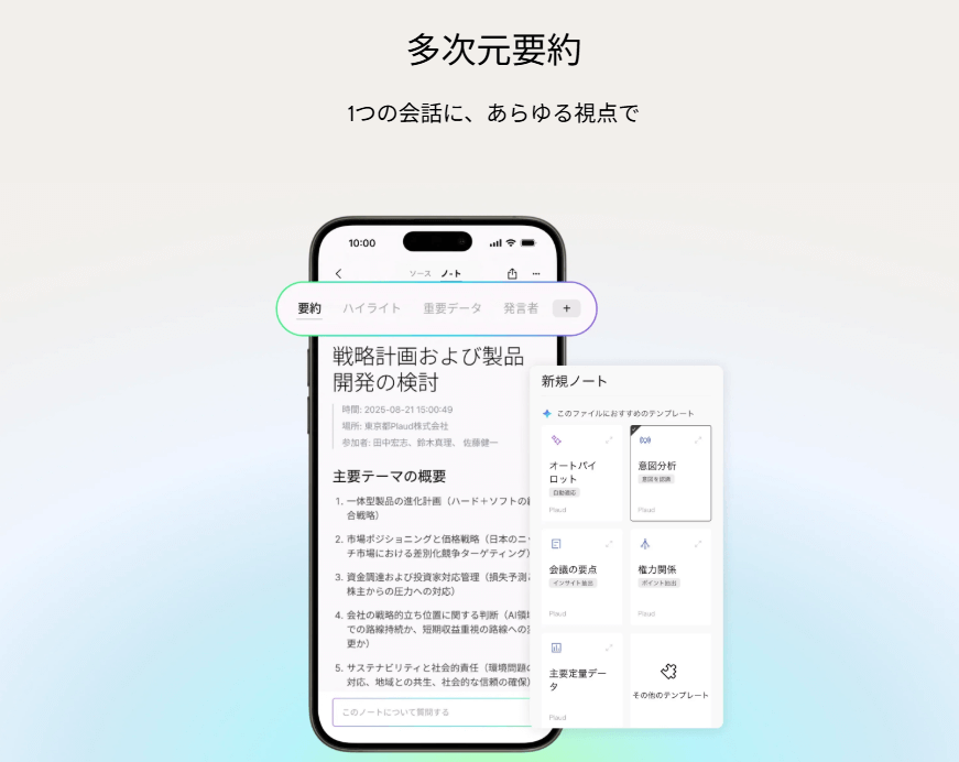 AIボイスレコーダーは、対面会議での収音性能や安定した文字起こし処理を前提に設計されており、業務利用を想定した機能やプランが用意されています。