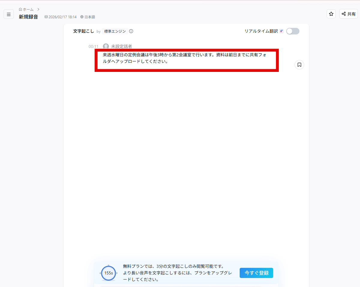 話者ごとの区別やデータの書き出し形式には制限がありますが、お試し、短い文字起こしであれば、無料の範囲で十分に対応できる内容です。