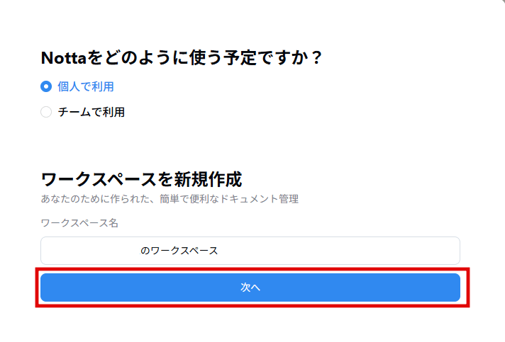 ワークスペースの名前を入力し、「次へ」ボタンを押します。