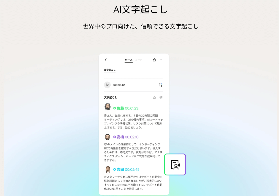 会議を録音すると、音声データはクラウドや端末内で解析され、テキストへ変換され文字起こしされます。製品によっては話者を区別して表示できます。
