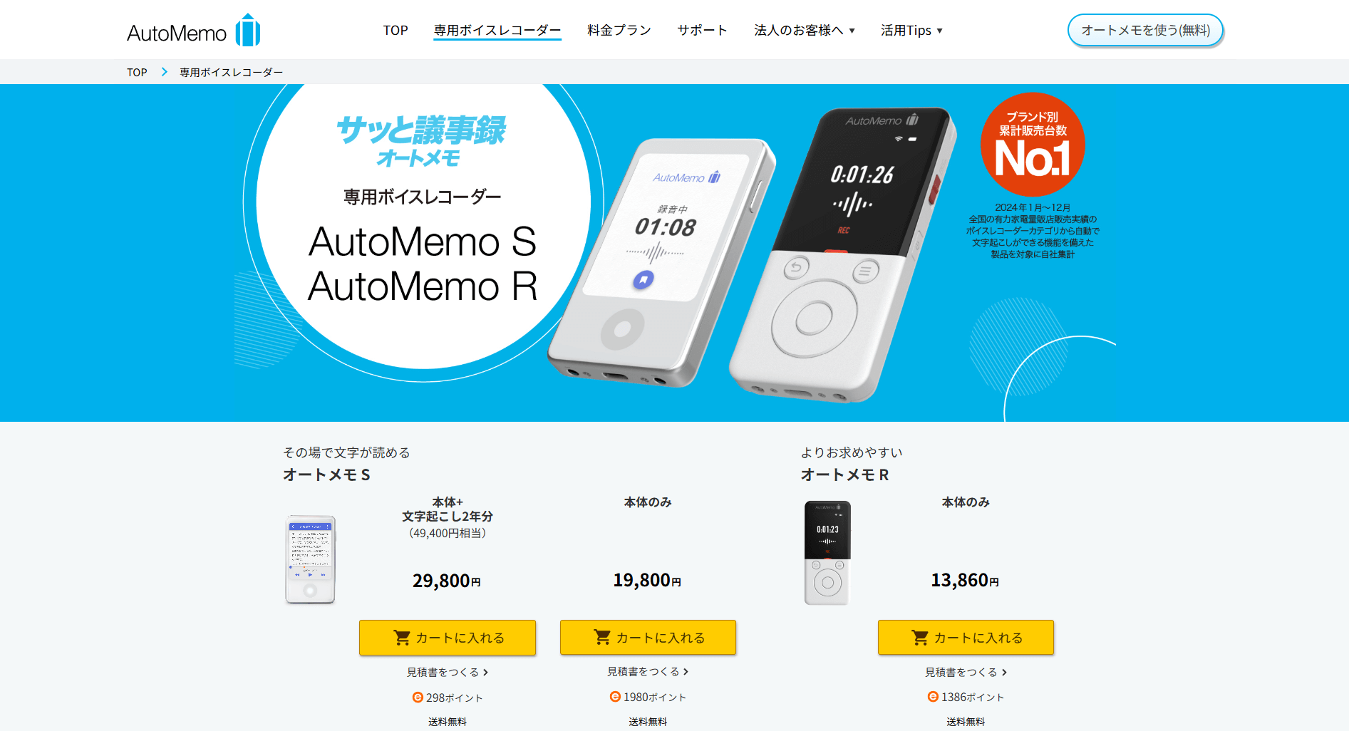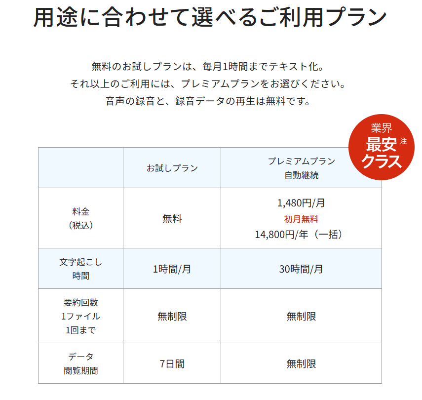 公式サイトでの販売価格は19,800円(税込)で、たとえば無料の「お試しプラン」では毎月1時間まで文字起こしが可能です。より長時間利用したい場合は「プレミアムプラン」を選択でき、月額1,480円または年額14,800円で毎月30時間の文字起こしに対応します。