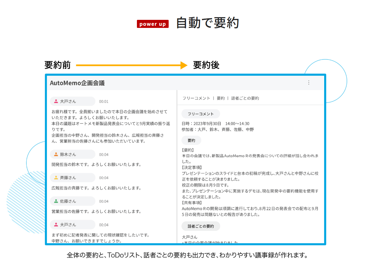また、文字起こしだけでなく、文字起こし後のデータを自動で要約して整理できる点もおすすめです。要約は「決定事項」「共有事項」といった形で見やすくまとめられるため、全文を読み直さなくても要点を押さえやすい設計です。