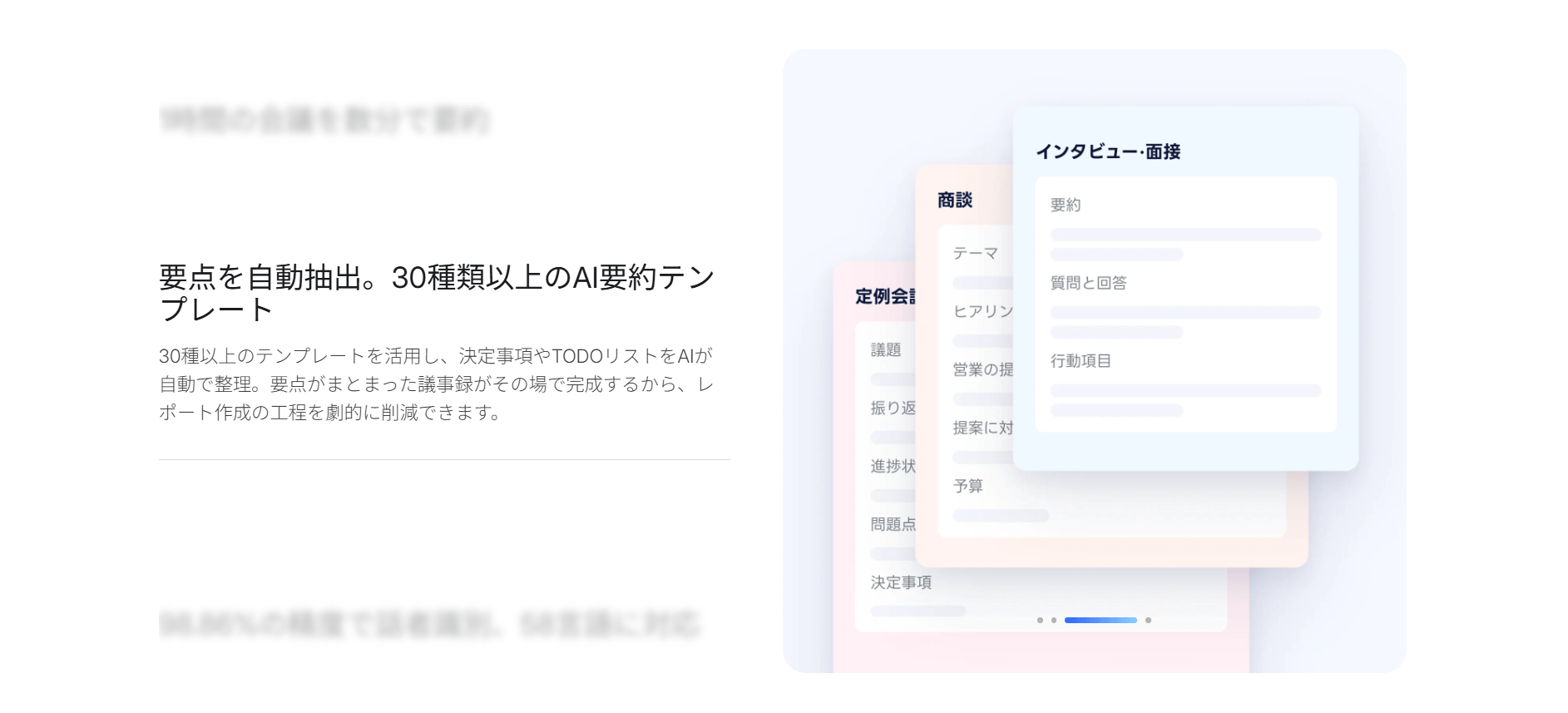NottaアプリはAIによる文字起こしの精度が98.86%と高精度で、さらに30種類以上の要約テンプレートも備えています。また、58言語に対応した翻訳機能も利用でき、外国語を含めた会議や通話でもスムーズに内容を整理できます。