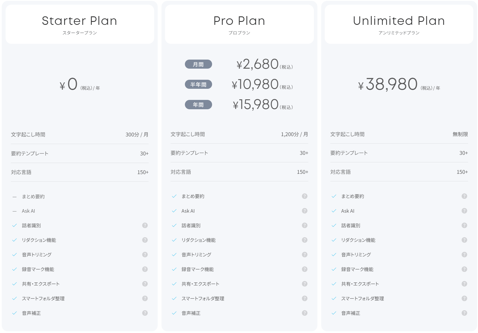 料金は、Starterは無料で、文字起こし時間は月に300分です。上位プランのProは年額15,000円(月額1,250円)で1500分/月、Unlimitedは年額36,000円(月額3,000円)で無制限です。