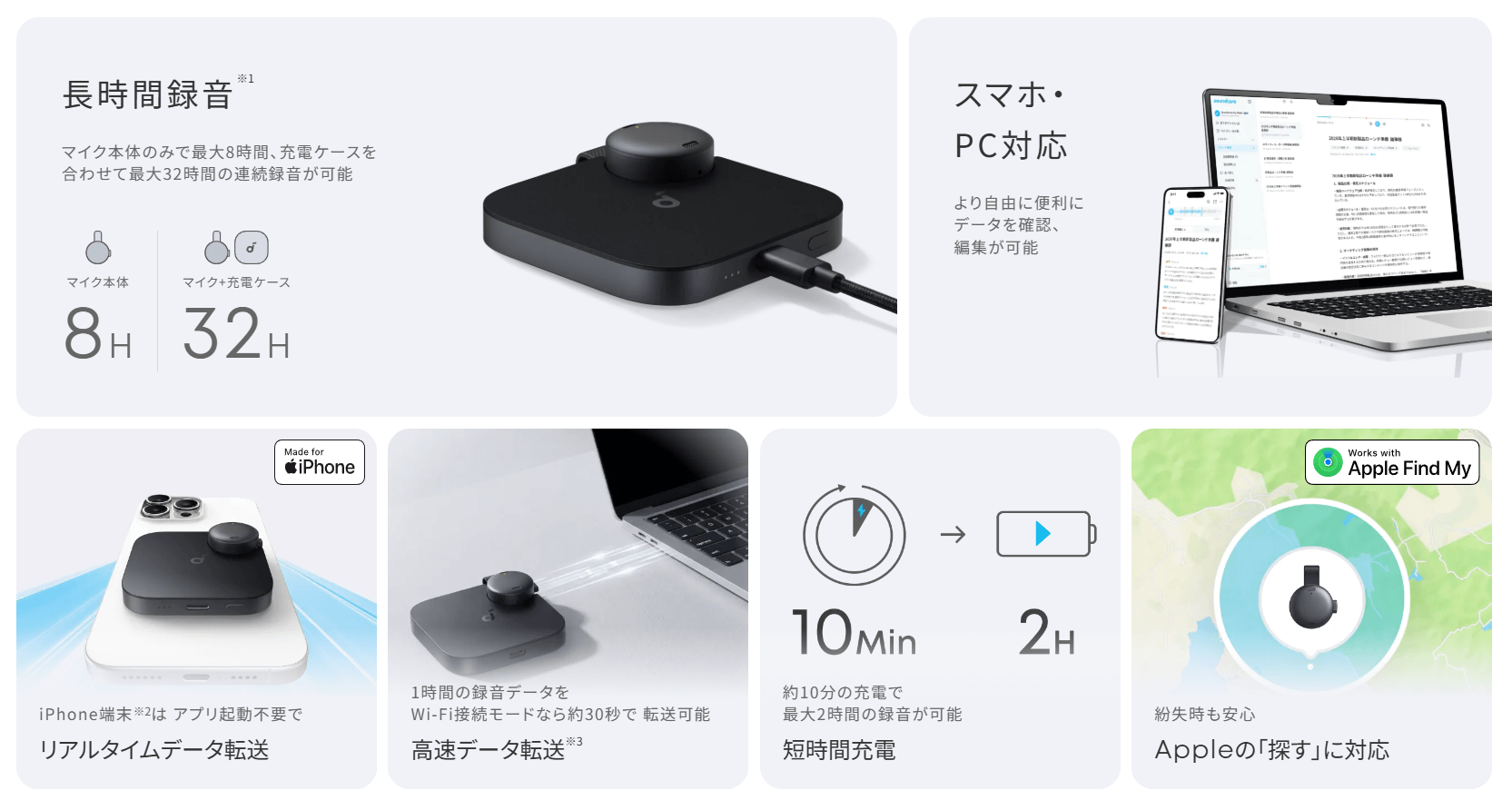 32GBのストレージ容量を内蔵し、約30時間の連続録音(待機時は約28日)が可能です。磁気充電に対応しており、約1.5時間でフル充電できるため、急な打ち合わせや長時間の外出時にも安心です。