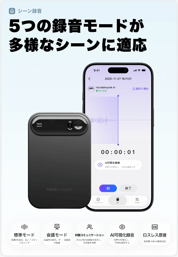 録音から文字起こし、要点整理した内容を、業務チャット(DingTalk)で共有する運用を想定しているのが「TALIX & DingTalk A1」です。会議・商談・取材メモを個人の端末内で完結させるより、チームで回覧し、次のアクションに落とし込む前提の使い方に向きます。