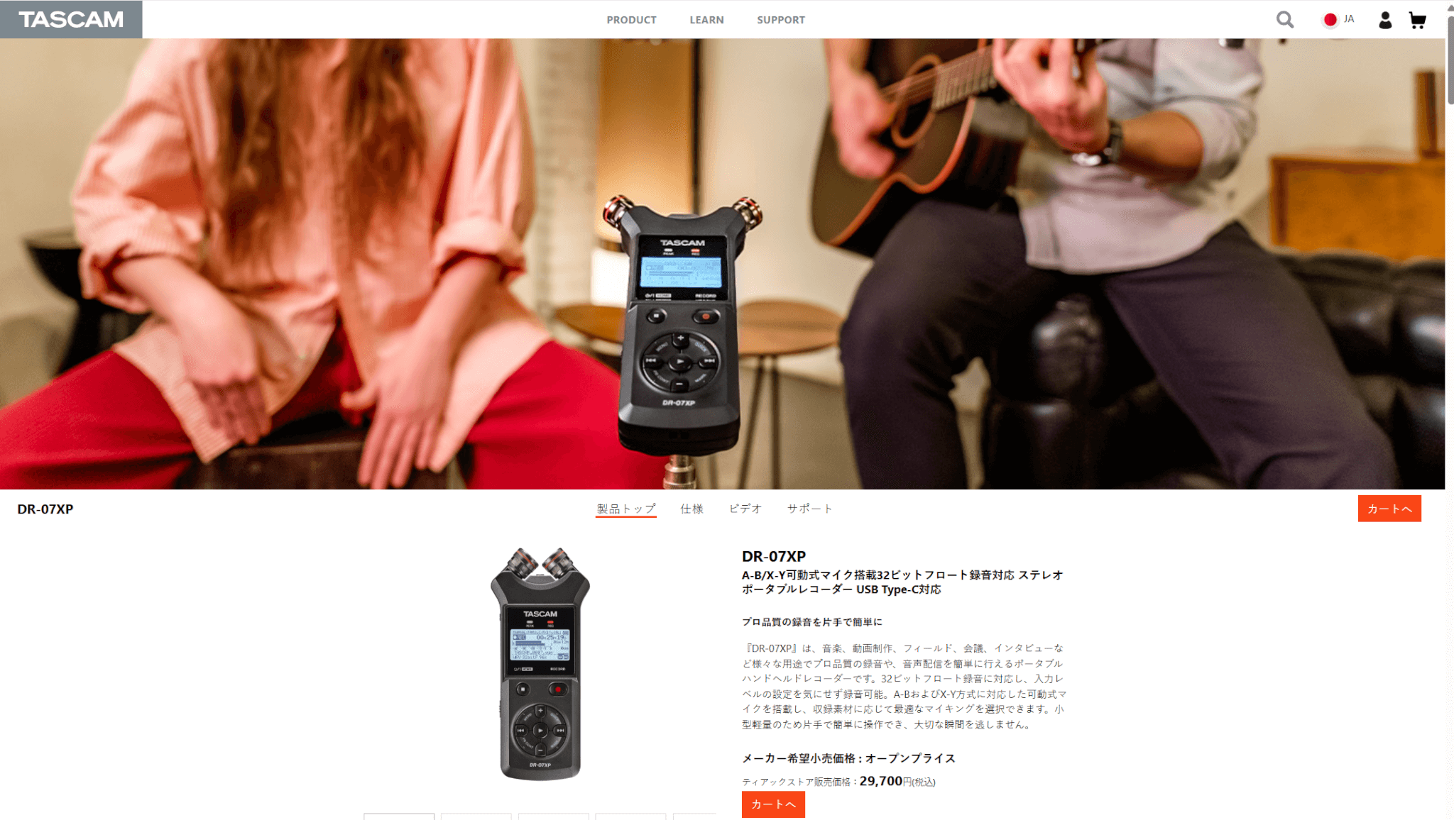 | TASCAM DR-07XP | ![]() | 29,700円 | 公式サイト | 高音質PCM録音 32-bit float対応 | ハンディPCM型 | 159.6×68×27mm | 184g(電池含む) | 最大17.5時間 | microSDカード microSDHCカード microSDXC(最大512GB) | 非対応 | A-B/X-Y可動式単一指向マイク | USB Type-C 各種microSD | |