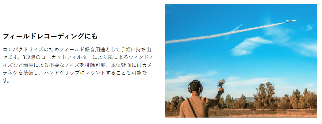 音質面では、ローカットフィルターやリミッター/ピークリダクションなどの機能に加え、RFノイズ(無線由来のノイズ)対策も施されています。環境に合わせて設定を組み合わせることで、扱いやすい収録を目指せます。