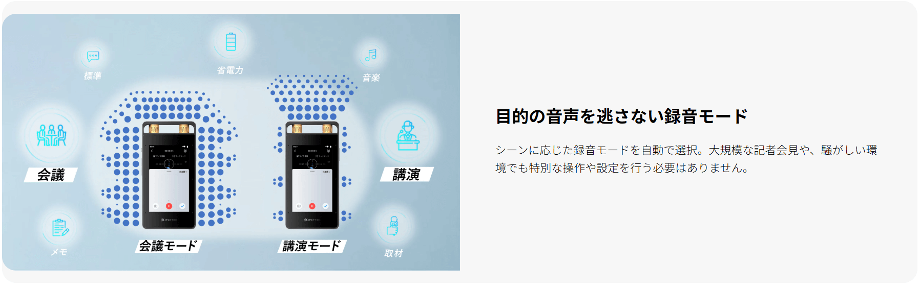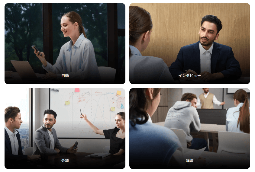 操作はシンプルで、必要なときにワンタッチで録音を開始できます。さらに、用途に応じて自動/会議/講演/インタビューの4つの録音モードを切り替えられるため、場面に合わせた収録・記録がしやすいのもポイントです。