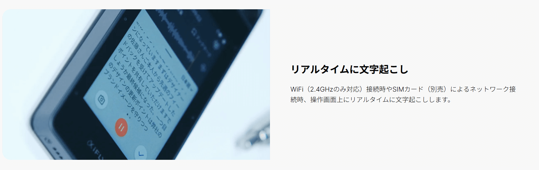 また、SR502Jはリアルタイム文字起こしを搭載しており、Wi-Fi(2.4GHz)接続時やSIMカード(別売)でネットワーク接続できる環境なら、操作画面上で文字起こしを進めやすい設計です。