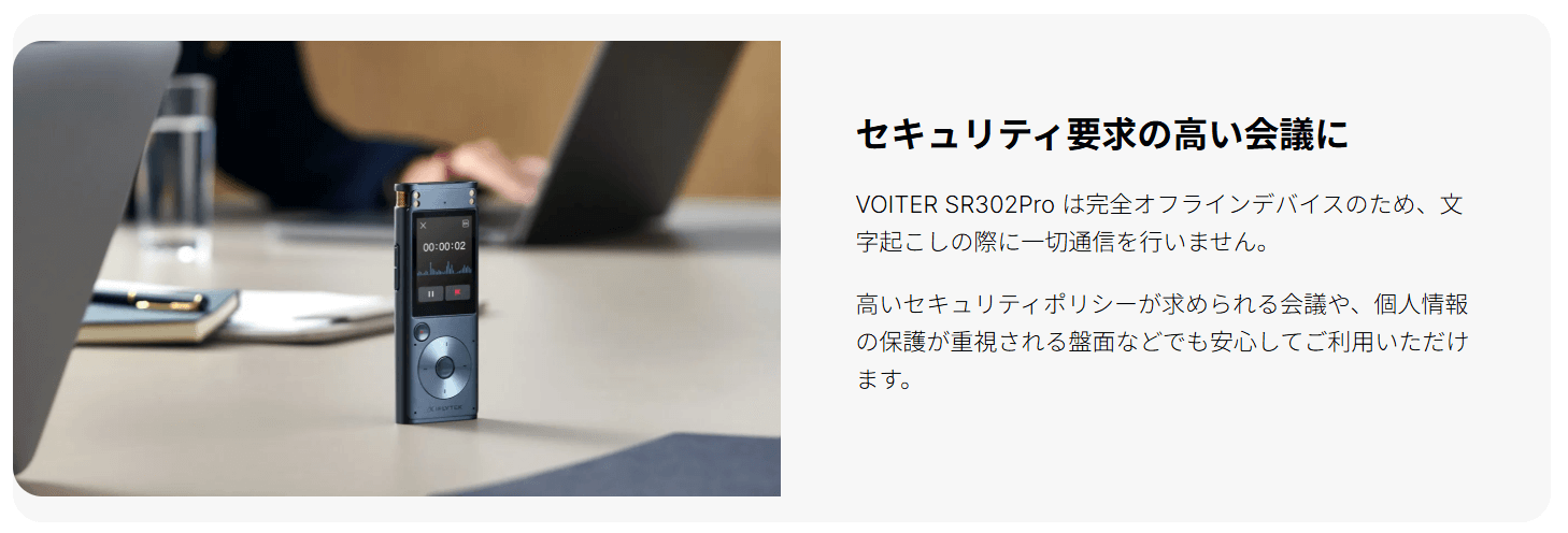 「VOITER SR302Pro」は、録音データをクラウドへ送らずに運用したい人向けの、iFLYTEK製「完全オフライン」AIボイスレコーダーです。インターネット接続を前提にせず、本体内で文字起こしまで完結できるため、機密性の高い会議・面談・個人情報を扱う打ち合わせでも使いやすい設計になっています。