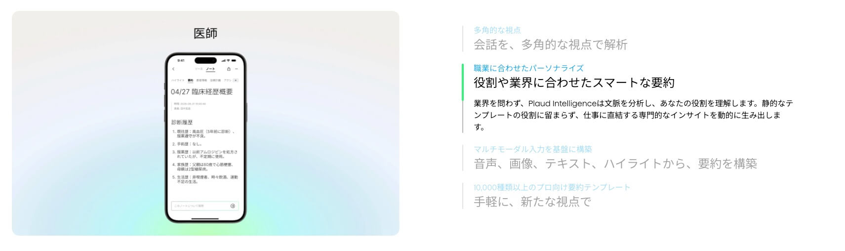 また、対面と通話を自動で切り替える「スマート・デュアルモード録音」を搭載。突然の電話でも対面モードと通話モードを切り替えるため、会話に集中しやすい設計です。