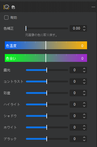 カラー補正機能も用意されており、露出や彩度、色温度まで基本的な補正機能が使用可能です。