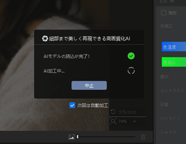 画像を追加すると、初回はAIモデルのダウンロードが完了した後に、高画質化処理が行われます。