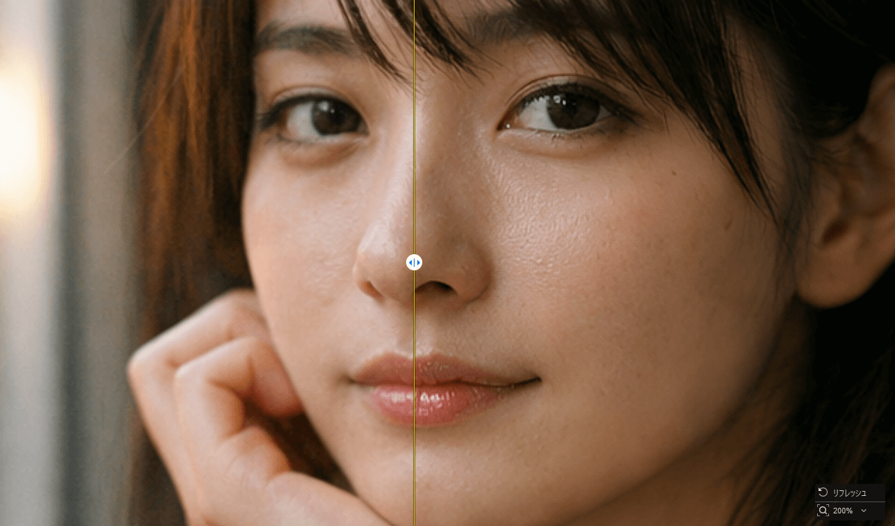 高ISO撮影で生じたザラつきはAIが検出して抑えつつ、肌や布地の質感は保たれます。軽度のピンぼけや手ブレも輪郭を自然に再構築し、不自然なシャープ感を避けた仕上がりになります。