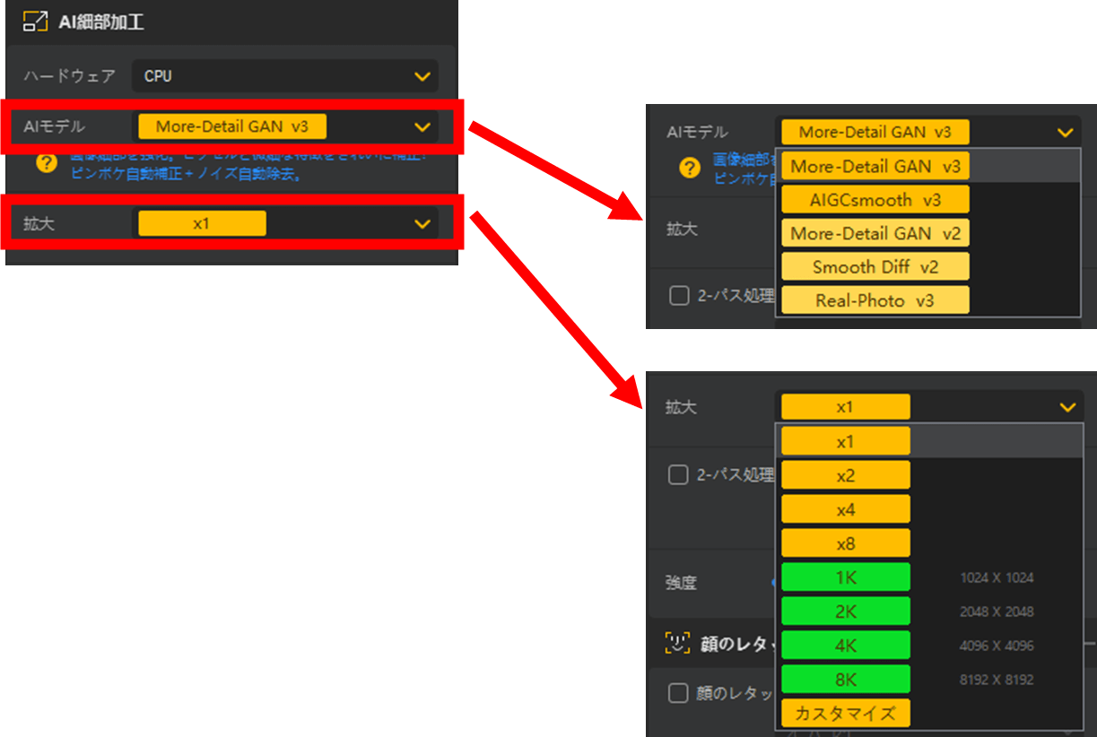 Detail系モデルはノイズも細部として残しやすいため、ノイズ低減を重視するならReal-PhotoやAIGCsmoothに切り替えると改善しやすくなります。それでも気になる場合は、倍率1×で一度ノイズ除去だけを行い、その後にアップスケールする方法も有効です。