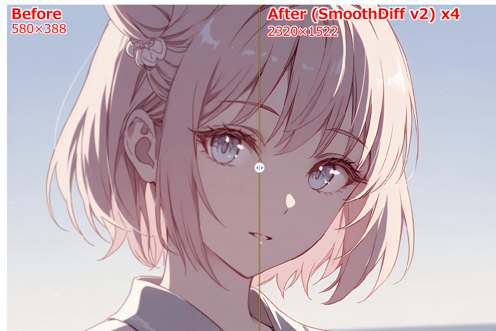 下の例は、元画像をSmooth Diff v2モデルを用いて4倍に拡大してフルHD程度の画質までアップスケールしており、PCディスプレイで見るには十分な鮮明度になっています。