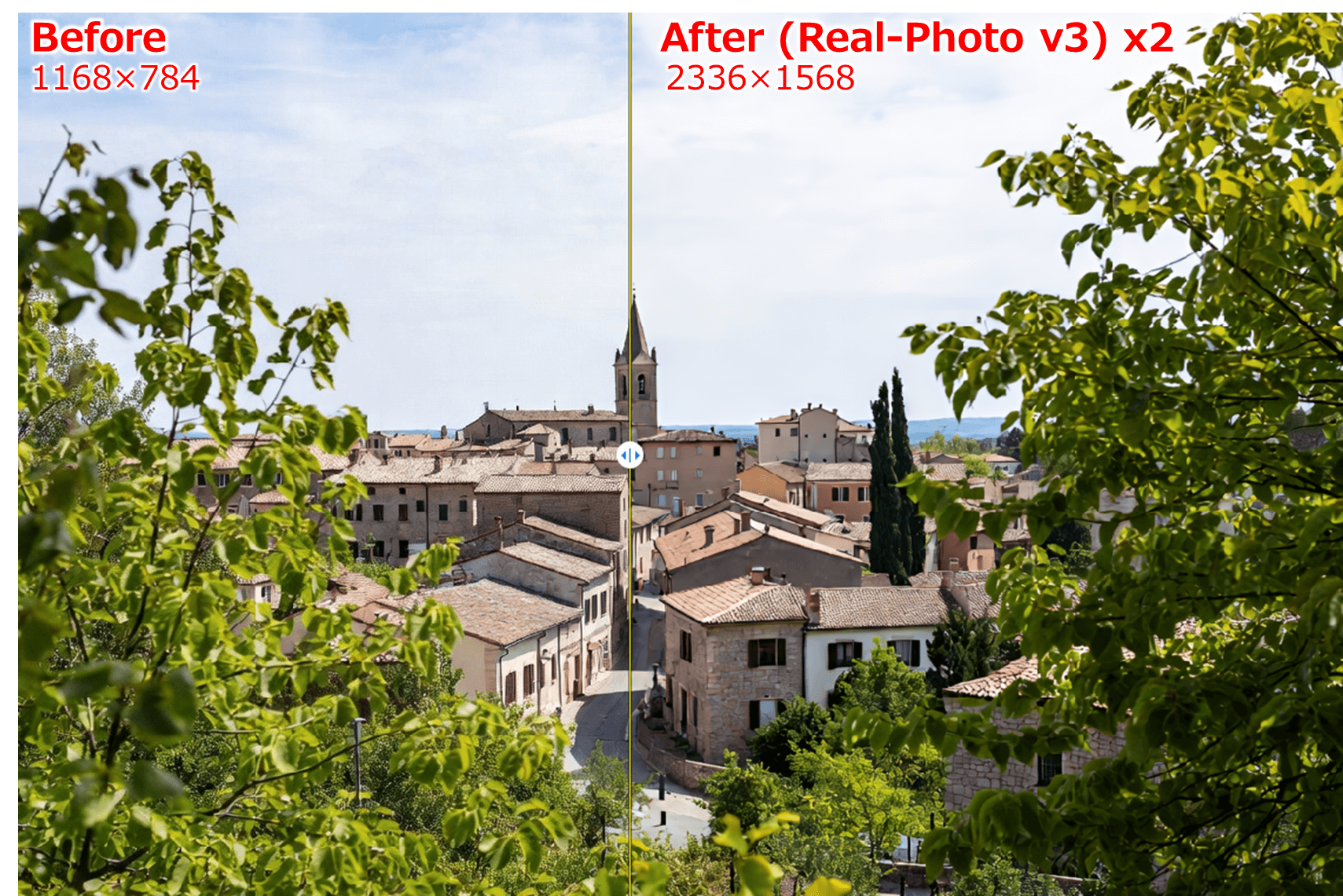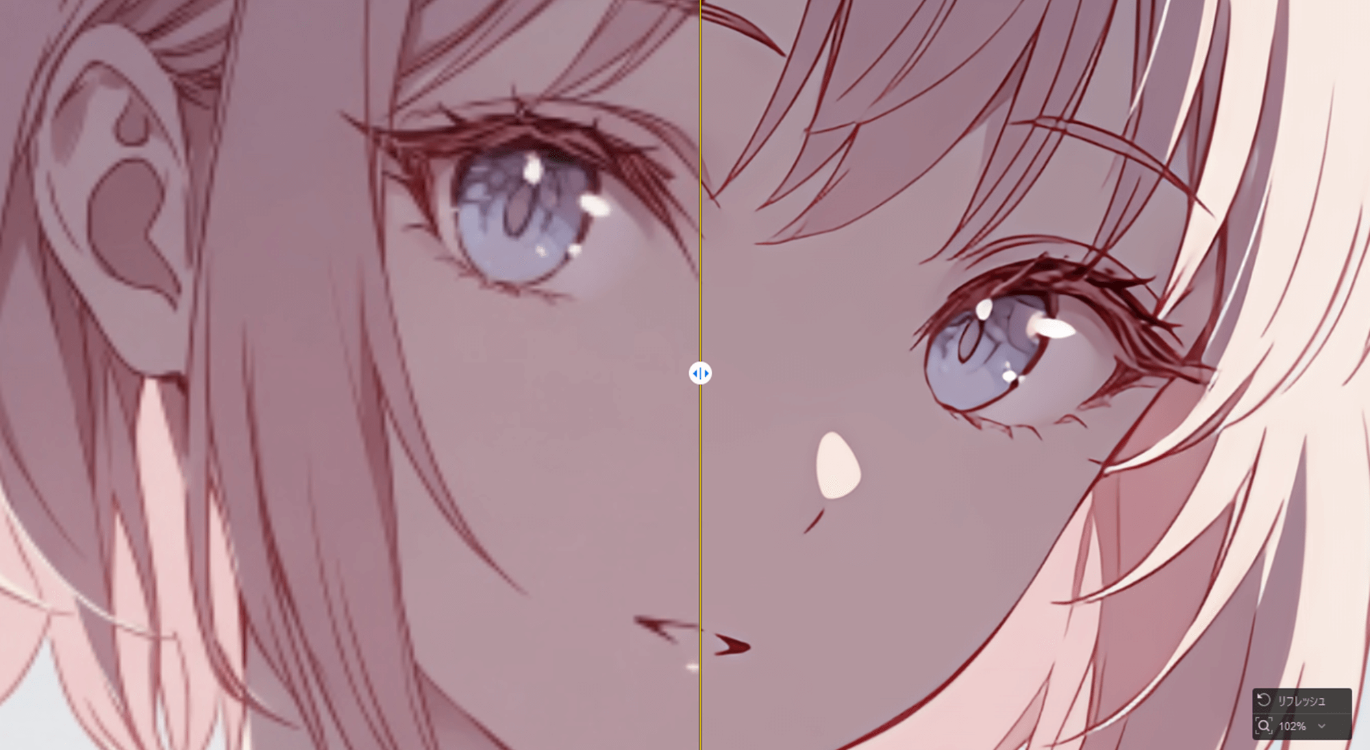 処理が完了すると下のように結果が表示されます。左側が元の画像ですが、スライダーを動かしてBefore/Afterの範囲を変更して確認することができます。
