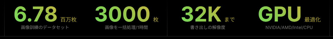 クラウドにアップロードしないため機密性の高い画像でも扱いやすく、インターネット接続がなくても動作します。GPU性能を活かせるため、解像度や処理枚数の制限が少なく、大量画像の一括処理にも向いています。