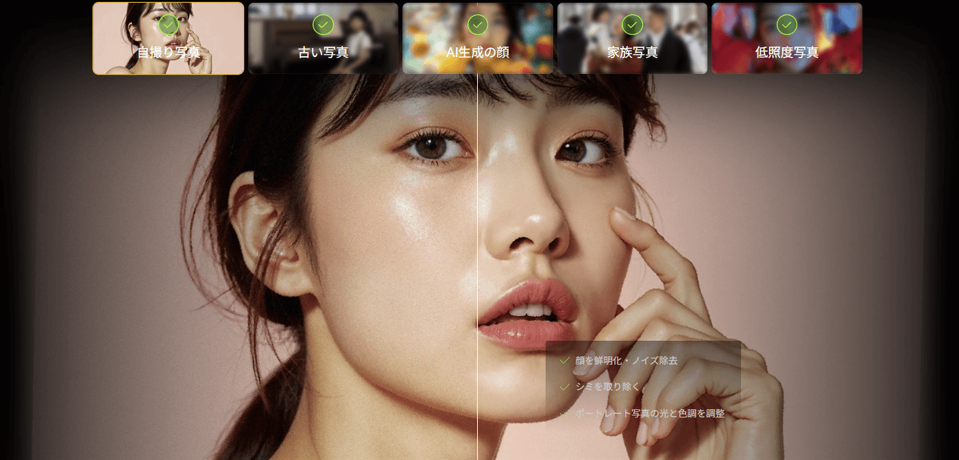人物写真では「顔のレタッチ」機能が有効で、瞳や肌の細部を保ちながら自然に復元でき、用途に応じて2つの適用モードを使い分けられます。
