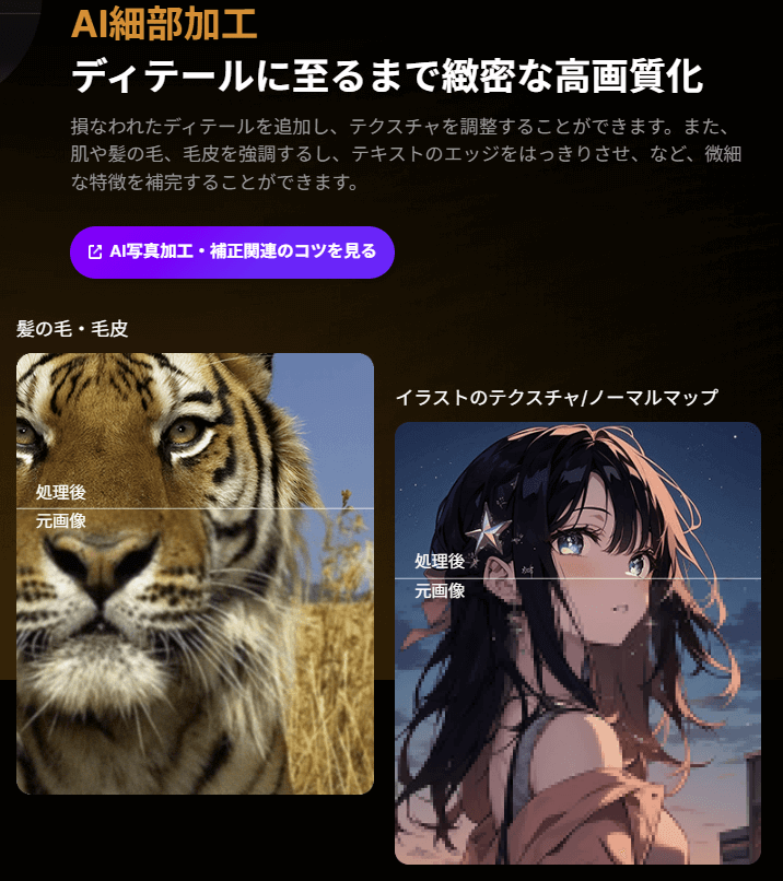 Aiarty Image Enhancerは解像度を拡大するだけでなく、ノイズ除去やぼけ補正、圧縮劣化の低減、ディテール強調といった高画質化を一度の処理で行える点が特徴です。