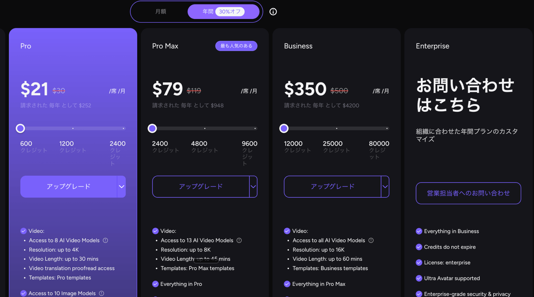 | Pro Max | $119 | $79/月 | $71.1/月 ($853.2/年) | 8K解像度やAPIアクセス、ワークスペースでの共同作業が必要な方やチーム | |