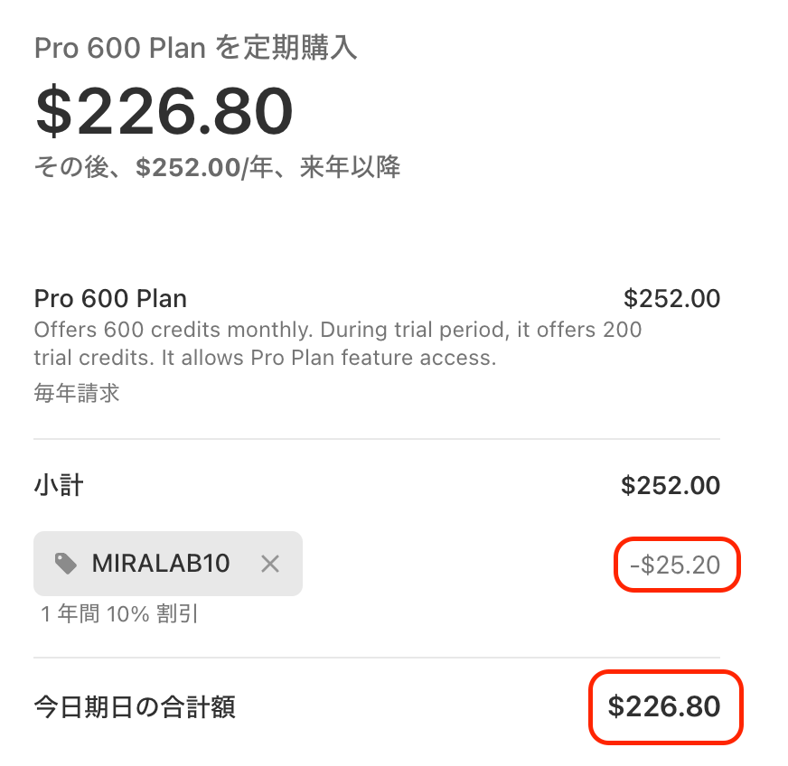 プロモーションコードを追加に「MIRALAB10」を入力しする。