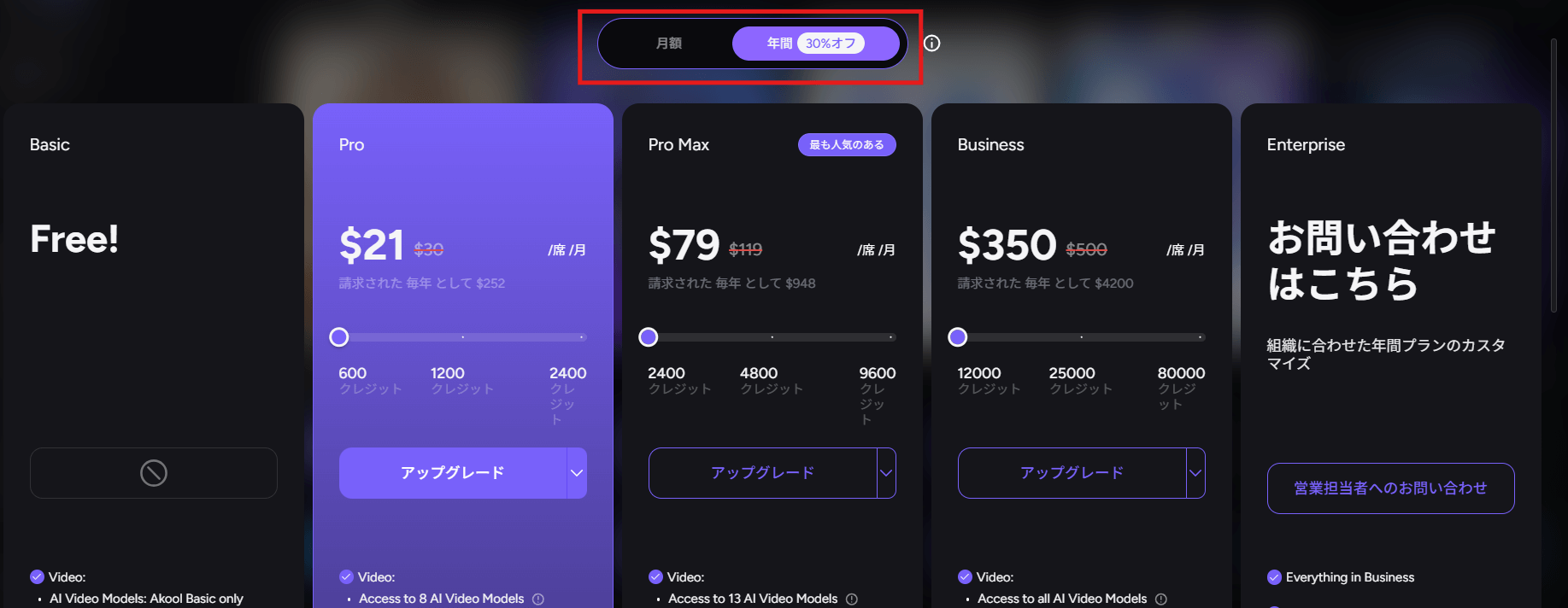 | 個人 | Pro | $30 | $21/月 | $18.9/月 ($226.8/年) | 4K動画の生成やフェイススワップを個人で利用したい方 |